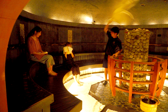 約90℃ 対流式タワーサウナは全6段で広い。30人は入れるか。