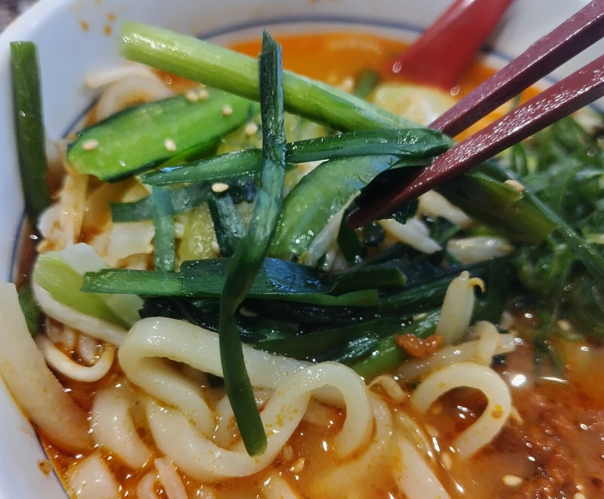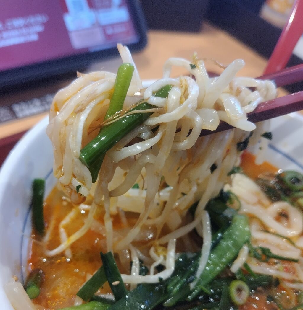ニラ、ネギ、モヤシ、青梗菜、ニンニクの芽と多く入っている。